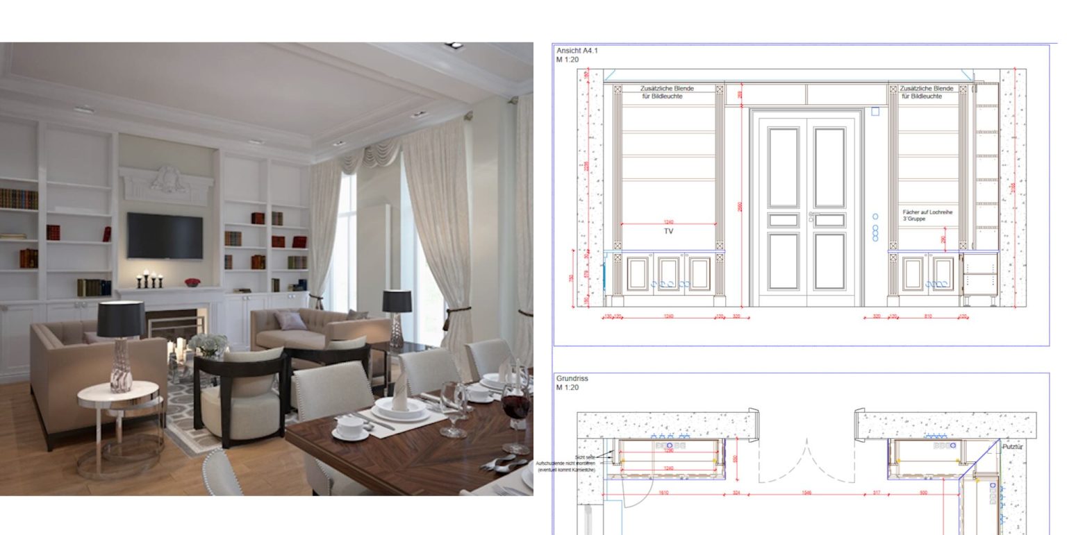 Hierbei wählen wir sorgfältig passende Materialien, Farben und Möbel aus, die perfekt zu Ihnen und Ihrem Projekt passen. Wir zeichnen detaillierte Grundrisse, Ansichten und spezifischen Details, um Ihnen eine klare Vorstellung davon zu geben, wie Ihr Wohntraum aussehen wird.