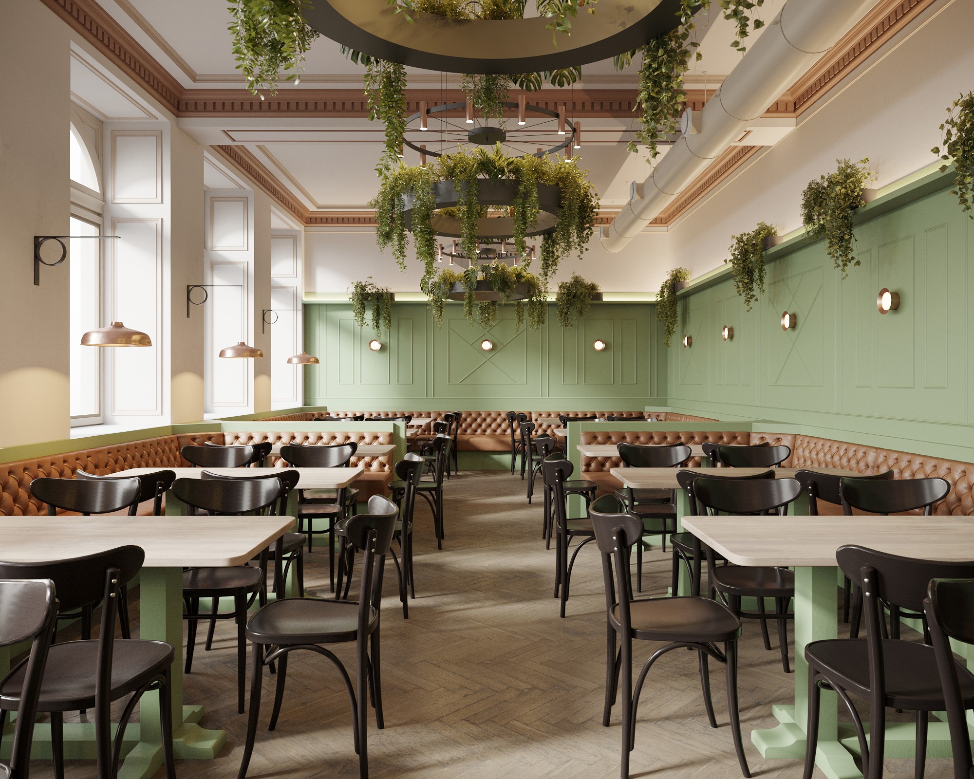 Die traditionellen Bugholz-Sessel und der Ledereinsatz der Sitzbänke, die oft in den alten Wiener Kaffeehäusern zu finden sind, werden durch die grüne Farbe und die modernen Esstische aufgelockert. Der bewusste Kontrast zwischen den beiden Bodenbelägen, einem modernen dunkelgrauen Fliesenboden und einem traditionellen Fischgrätenparkett in hellem Eichenholz, unterstreicht die Verschmelzung von Alt und Neu.