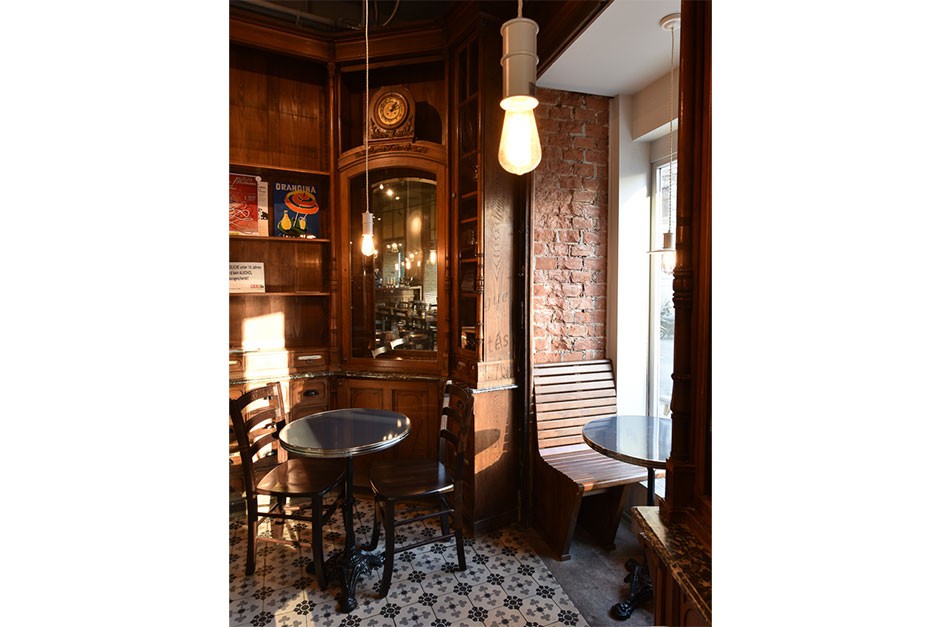 Die originalen Wandregale der Jahrhundertwende und der restaurierte Tresen, von einem Tischler kunstvoll aufgearbeitet, verleihen dem Bistro eine eigene Identität und schaffen eine besondere Atmosphäre. Die übrigen Möbel wurden gezielt passend zu diesem Stil ausgewählt, sodass die Verbindung von historischen Elementen und modernem Flair harmonisch gelingt.