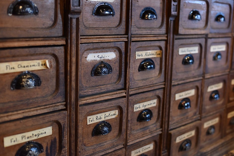 Das sorgfältig ausgearbeitete Farbkonzept orientiert sich an den ursprünglichen Farben der Apotheke und präsentiert den Raum in einem einladenden dunklen Braunton mit dezenten schwarzen Akzenten, die eine behagliche und entspannte Atmosphäre schaffen.