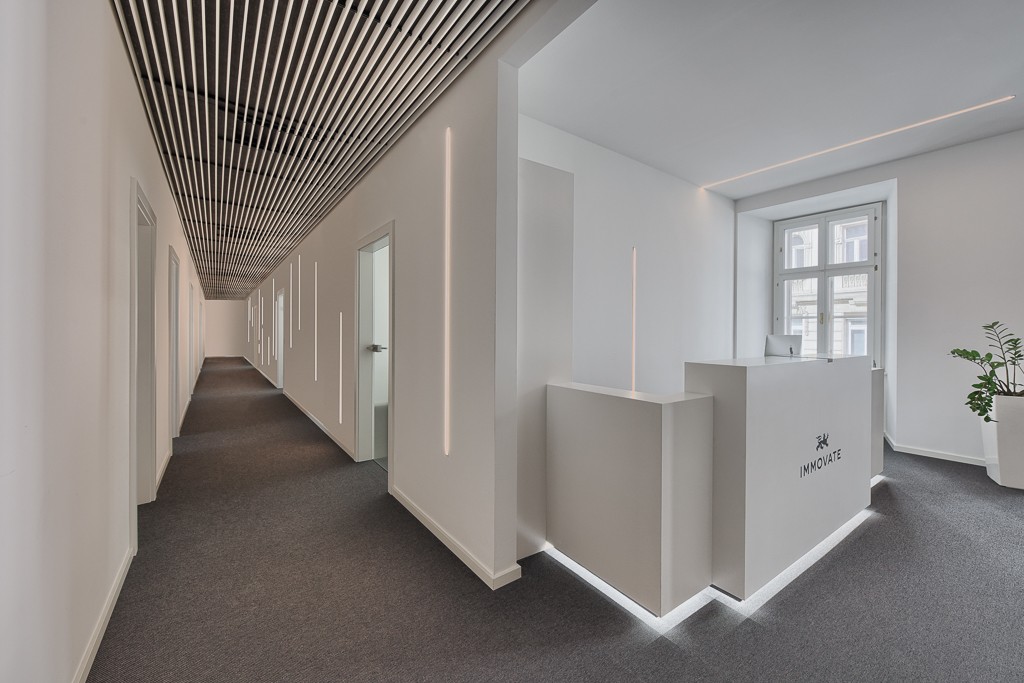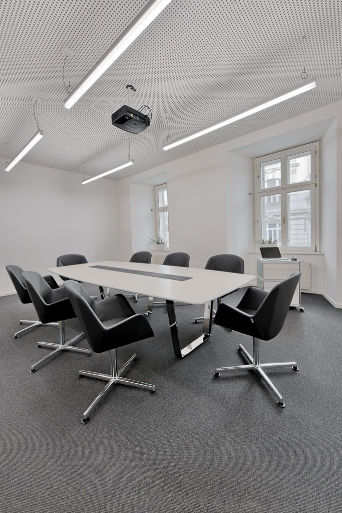 Die Beleuchtung im Empfangsbereich und im Gang wurde als eigenes Designelement konzipiert. Leuchtstreifen entlang der Decke, die sich bis zur Wand ziehen, leiten den Weg zu den Konferenzräumen. Die klare Form und Symmetrie der Streifen verleihen den Räumlichkeiten eine gewisse Strenge und setzen zugleich ein markantes gestalterisches Element.