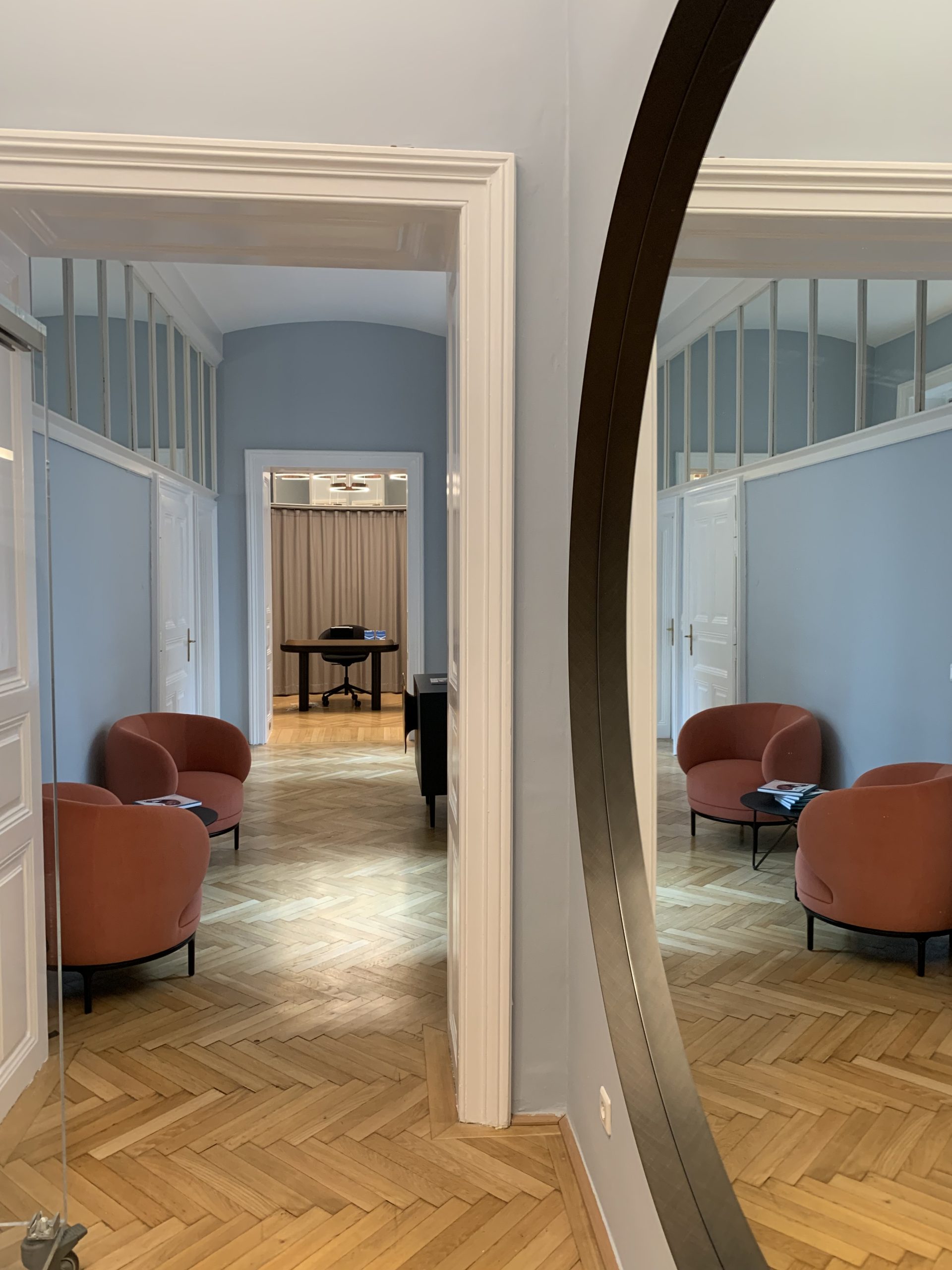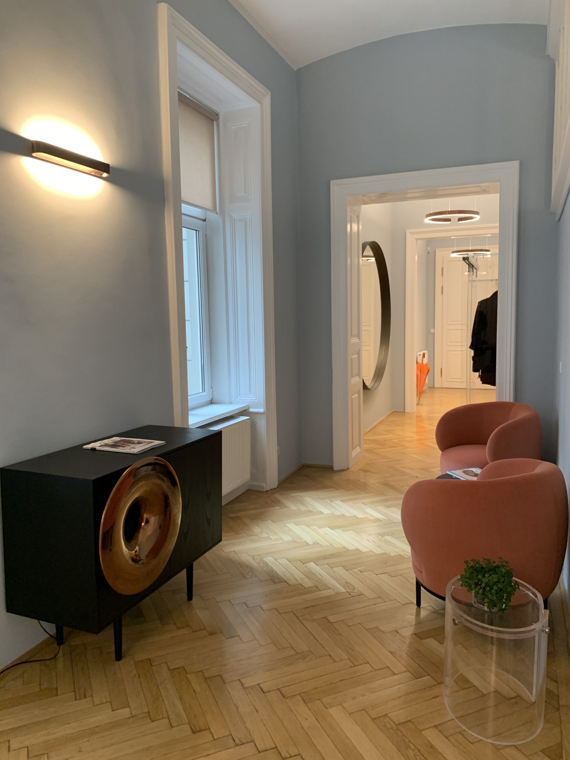 Die Zahnarztpraxis in Wien zeichnet sich durch eine leicht verspielte Innenraumgestaltung aus. Das schlichte Design erhält durch geschickt platzierte runde Formen eine spielerische Note, die sich sowohl in Möbeln, Beleuchtung als auch Dekorationselementen widerspiegelt. Diese runden Elemente verleihen der Einrichtung einen zeitlosen Charakter, wobei auch die Architektur der Räume gelegentlich von runden Formen durchzogen ist.
