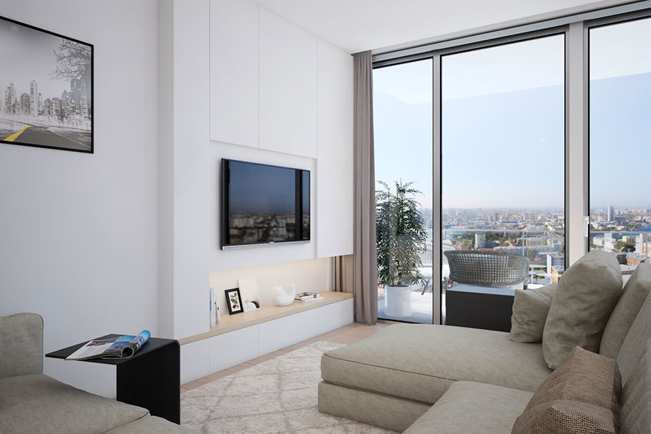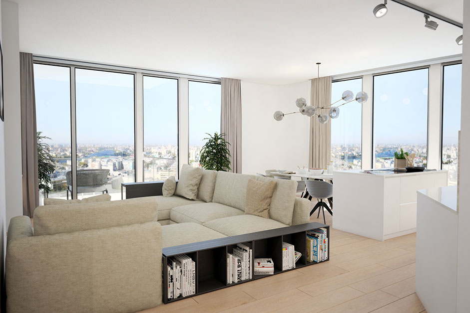 Der Mittelpunkt der Grundrissplanung liegt im offenen Ess- und Wohnbereich, der als Herzstück der Apartments konzipiert wurde. Große Glasfronten ermöglichen einen beeindruckenden 180-Grad-Blick über Wien, der die Bewohner einlädt, das städtische Geschehen draußen zu beobachten. Die schlichte Einrichtung schafft eine ruhige Atmosphäre, die als willkommener Rückzugsort von der Hektik der Straßen dient.