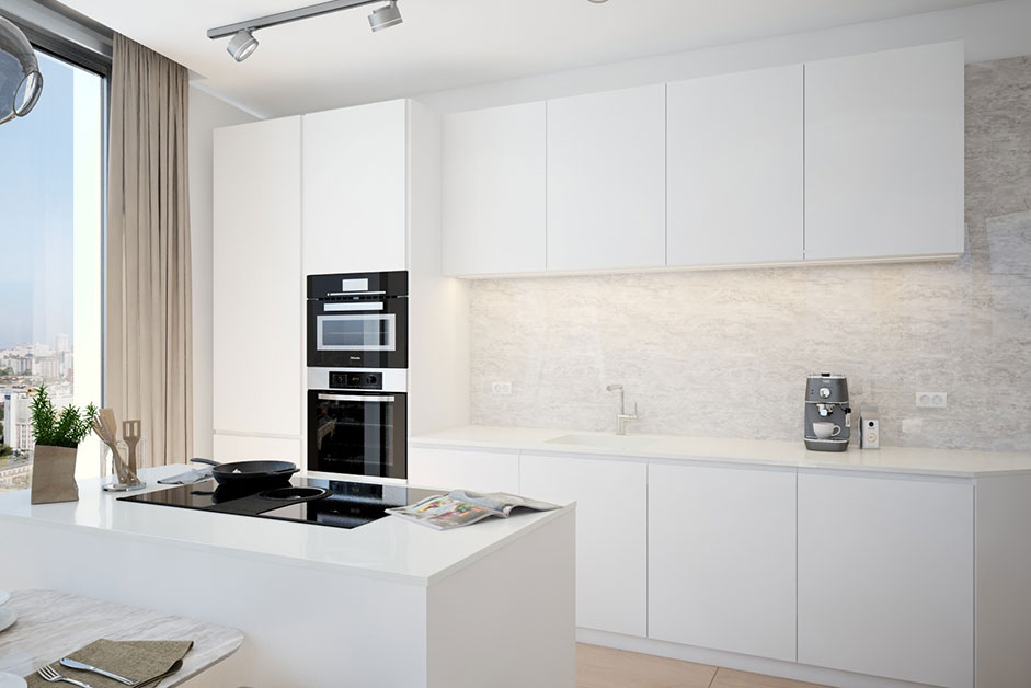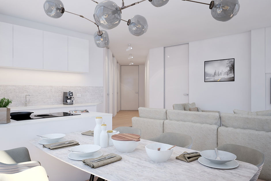 Die sorgfältig ausgewählten Materialien, darunter Marmor und weißes Holz, unterstreichen das gewünschte Design von Eleganz und Luxus. Die Einrichtung präsentiert sich in hellen Weiß- und Beigetönen, welche von einzelnen dunklen Details, geschickt unterbrochen werden. Durch die harmonische Kombination von Farben und Materialien strahlen die Apartments trotz ihres modernen Stils eine behagliche Gemütlichkeit aus.