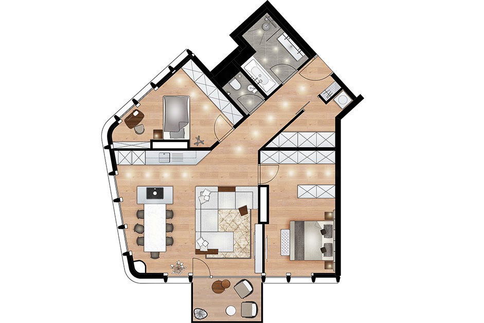 So entsteht in den Räumlichkeiten eine harmonische Verbindung zwischen modernem Stil, Luxus und einer entspannten Wohnatmosphäre.