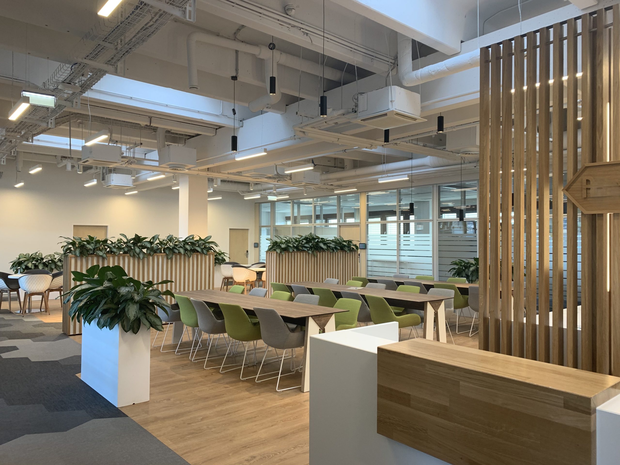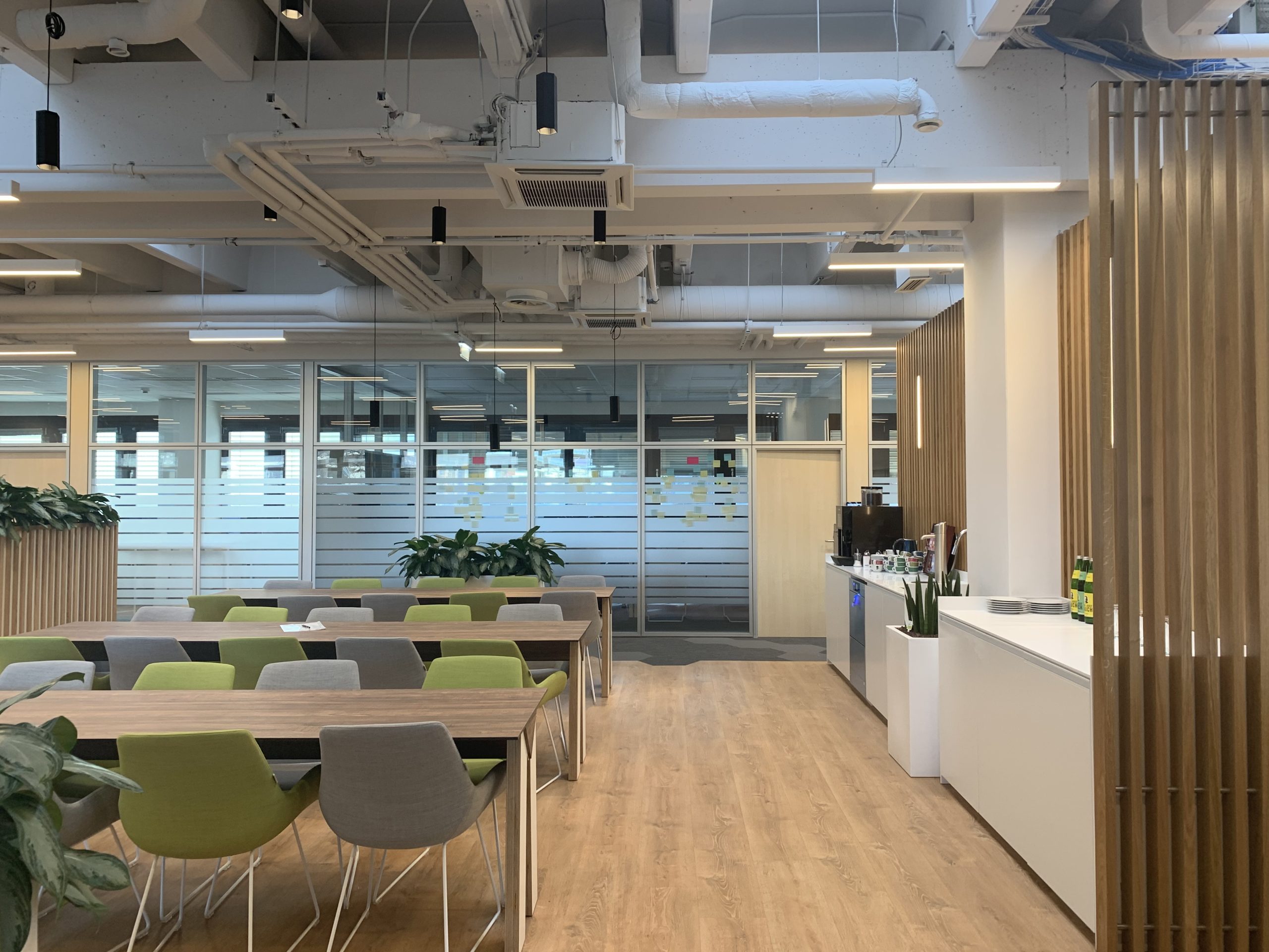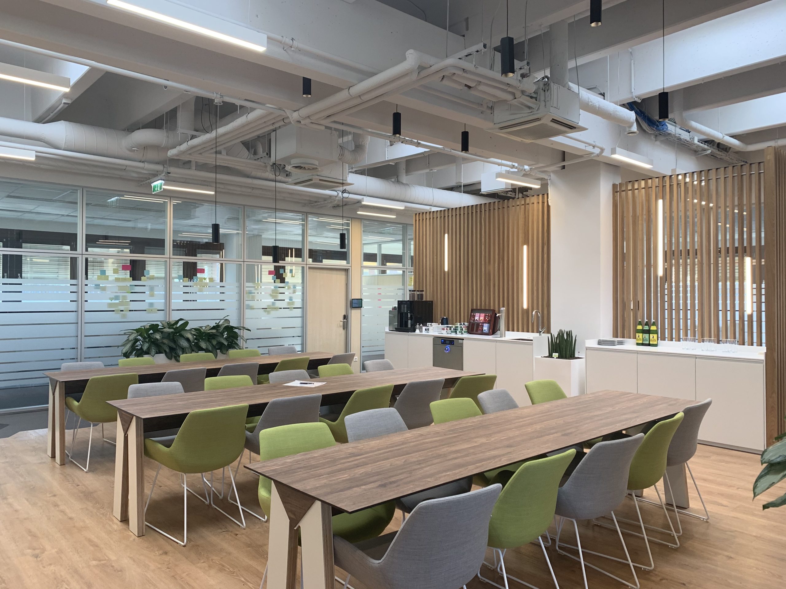 Die Verwendung von Pflanzen ermöglichte es, die Natur in den Raum zu integrieren. Besonders herausstechend sind die hellen Holzlamellen, die als Trennwände, Wand- und Deckenverkleidungen fungieren. Die abgehängte Lamellendecke in der Break-out Area dient als Kontrast zu der offenen Betondecke mit sichtbaren Leitungen und technischer Beleuchtung. Sie zoniert die Fläche und verbessert die Akustik im offenen Pausenbereich.