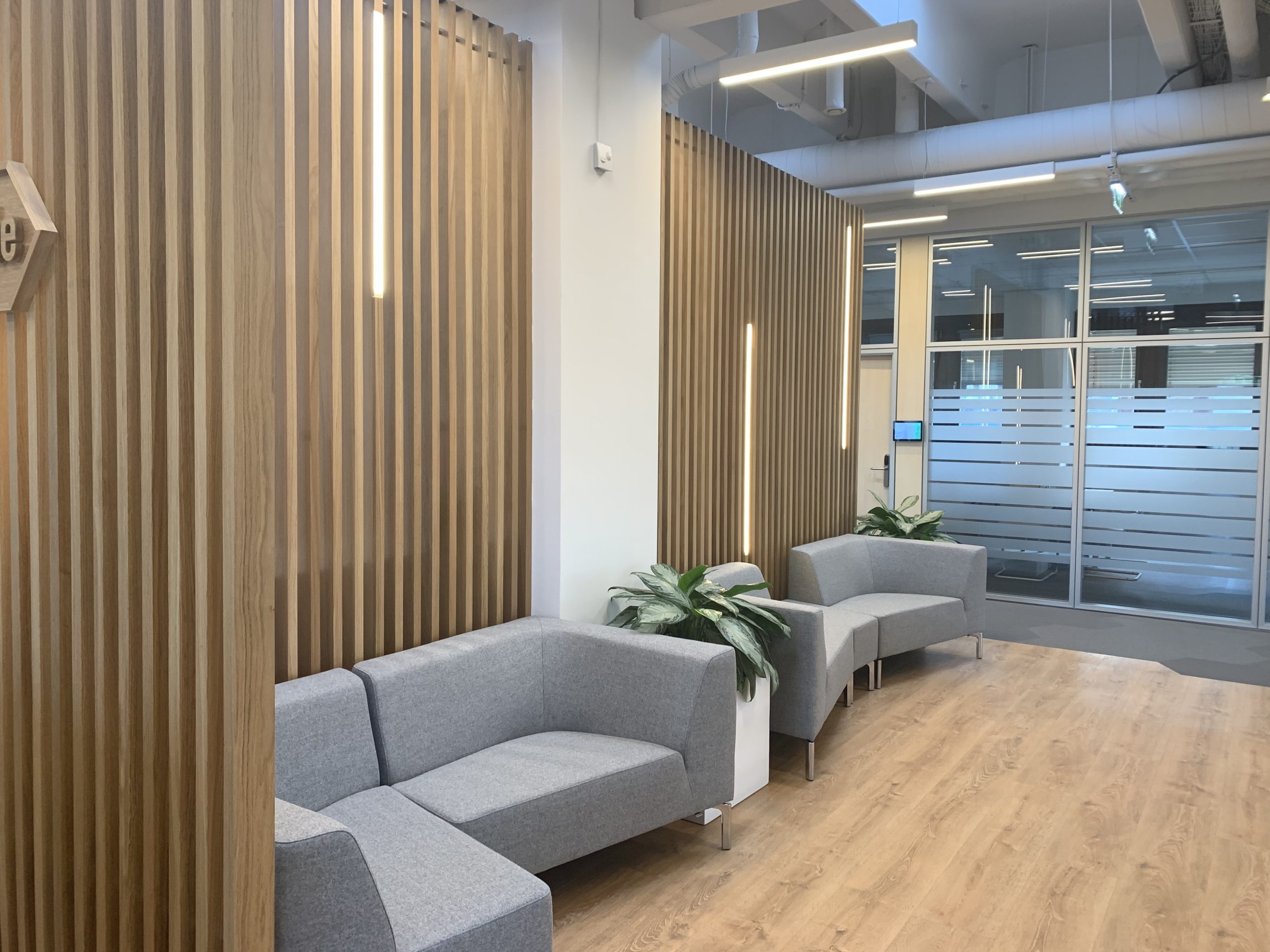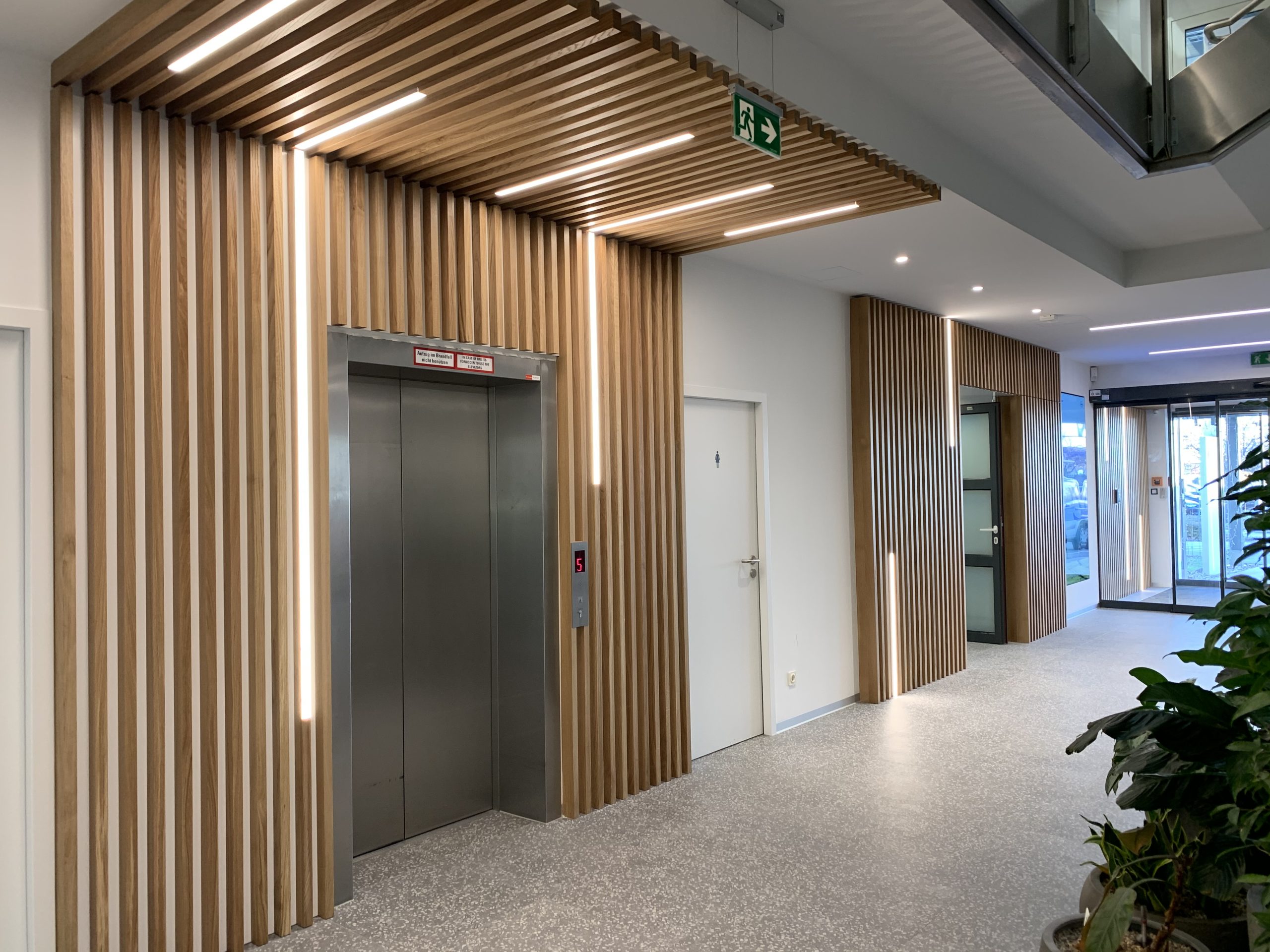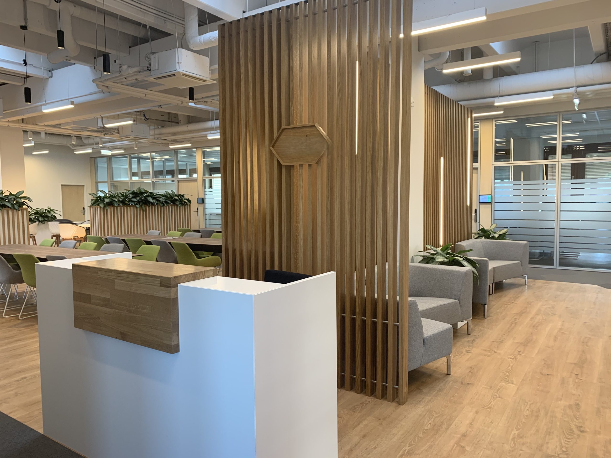 Die Verwendung von Pflanzen ermöglichte es, die Natur in den Raum zu integrieren. Besonders herausstechend sind die hellen Holzlamellen, die als Trennwände, Wand- und Deckenverkleidungen fungieren. Die abgehängte Lamellendecke in der Break-out Area dient als Kontrast zu der offenen Betondecke mit sichtbaren Leitungen und technischer Beleuchtung. Sie zoniert die Fläche und verbessert die Akustik im offenen Pausenbereich.