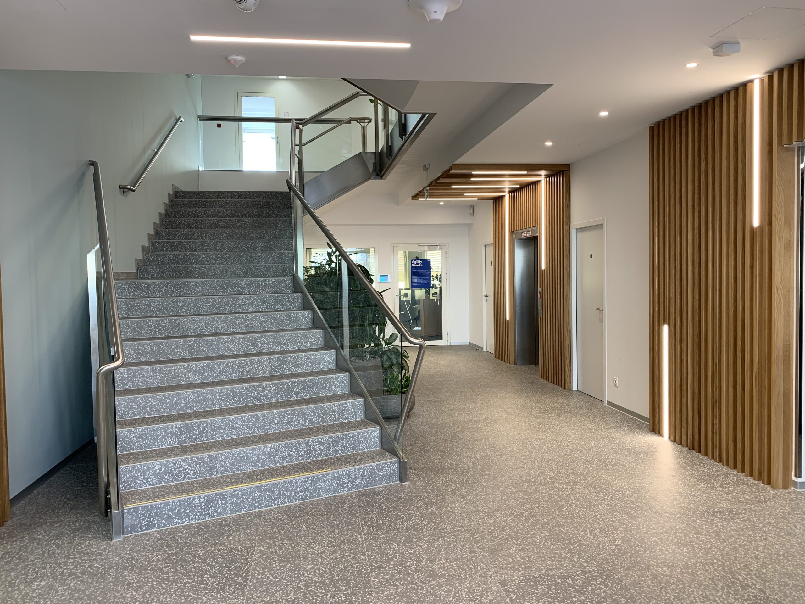 Der Gebäudeteil mit dem großem Veranstaltungssaal erhielt ein moderneres und schlichteres Design, wobei ebenfalls mit hellen Farben gearbeitet wurde.