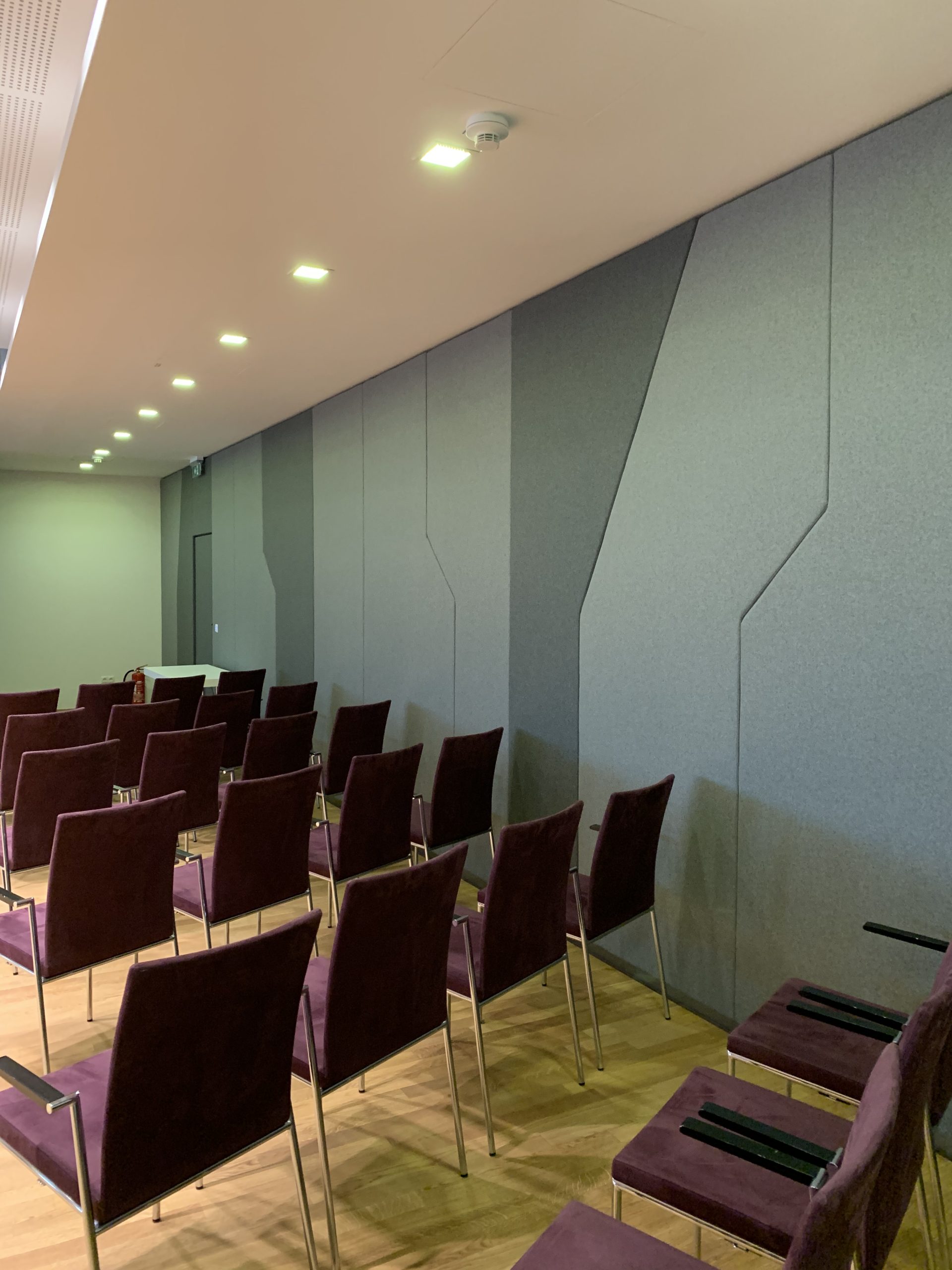 Die Wände sind mit akustisch wirksamen Polsterungen in grafischen Formen verkleidet. Für die Regiekabine wurde die Lamellenstruktur eingesetzt, die ebenfalls akustisch wirksam ist.