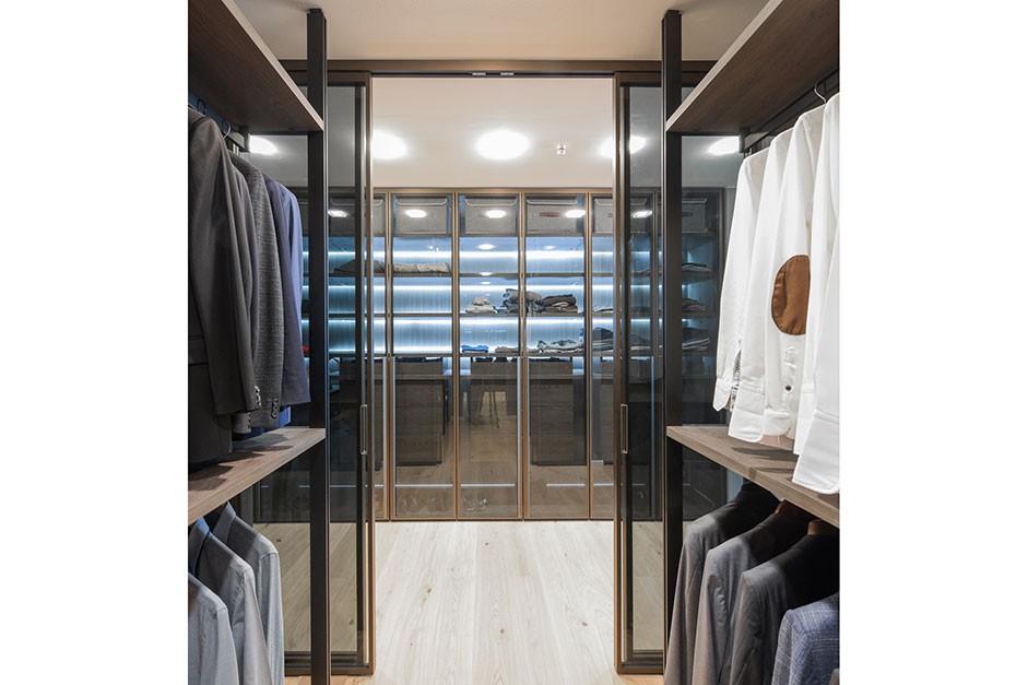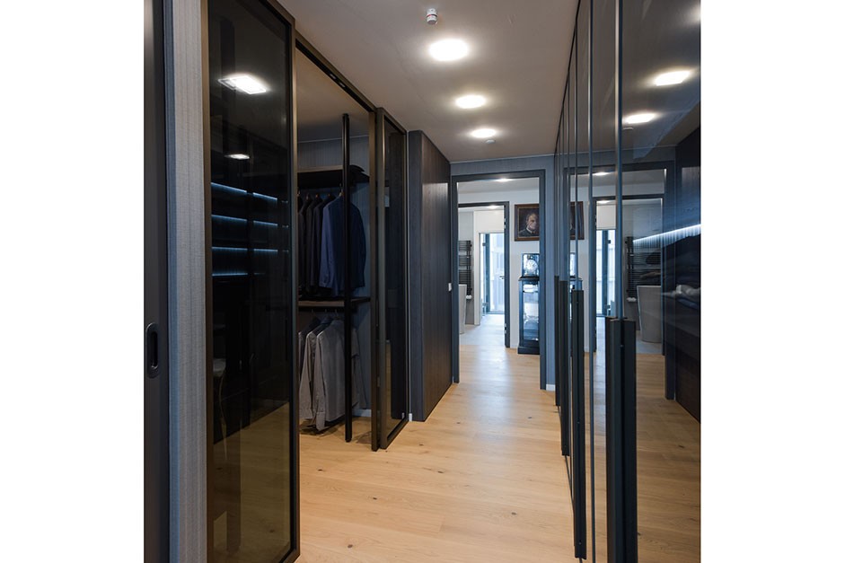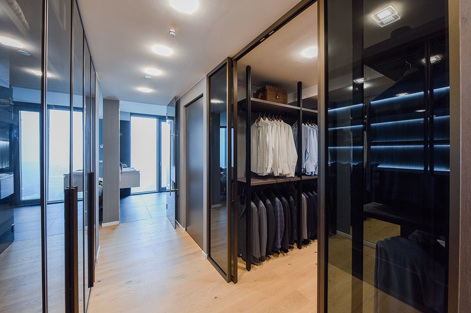 Der Schrankbereich wurde auf Maß geplant und zusammengestellt. Die verdunkelten Schiebetür – Glasfronten, die raumhohen Türrahmen aus bronzefarbenen Alu-Profilen und die dunklen Holzdetails zeugen von Raffinesse. Die integrierte LED-Beleuchtung setzt jeden Kasten gekonnt in Szene und unterstützt bei der täglichen Kleiderwahl.