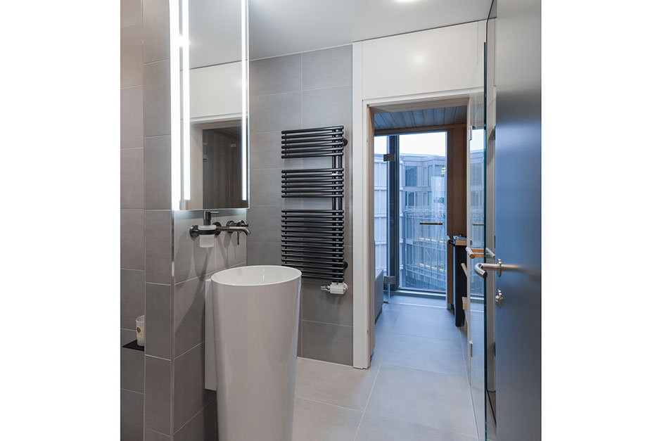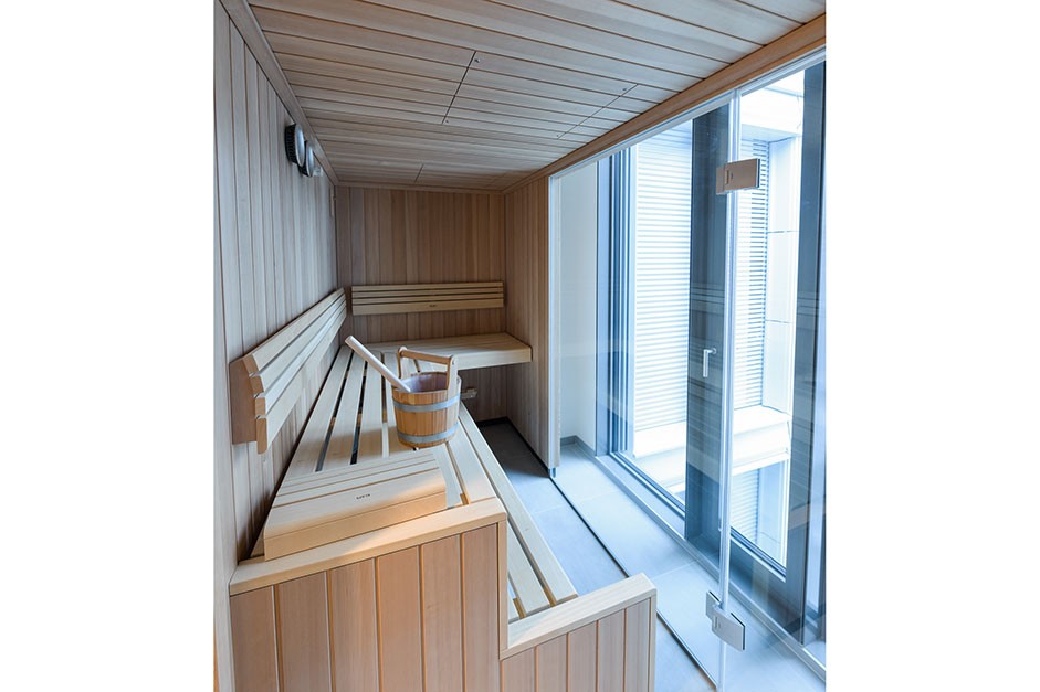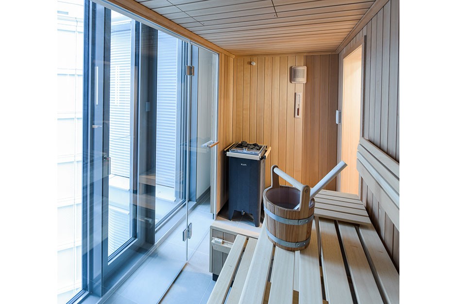 Um der Loftwohnung eine zusätzliche Besonderheit zu verleihen, wurde eine private Sauna von Klafs integriert. Die Sauna fügt sich nahtlos in das Wellnessbad mit freistehendem Waschbecken ein und bietet einen sensationellen Rund-um Blick über die Stadt.