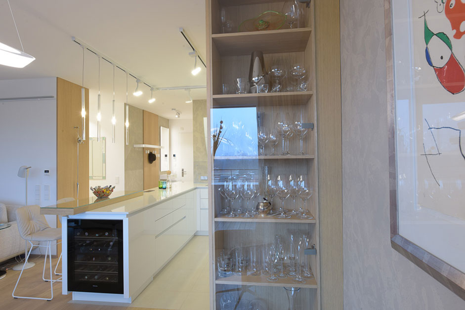 Dabei wurden zahlreiche verschiedene Formen, Materialien, Farben und Designs verwendet, die schlussendlich perfekt aufeinander abgestimmt sind und ein schlüssiges Gesamtkonzept bilden. Die Einrichtung verbindet Küchenmöbel übergangslos mit tischlergefertigten Garderobenmöbeln im Vorraum.