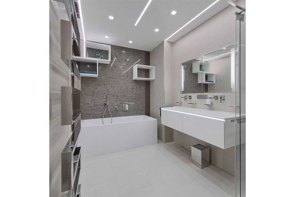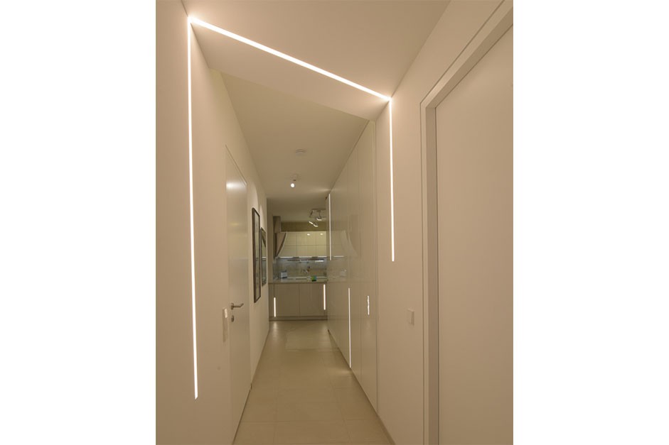 LED-Beleuchtung. Neben speziellen Dekorationsleuchten, die interessante Details setzen, kommen moderne LED-Streifen in verschiedenen Bereichen zum Einsatz. Besonders im Gang, wo sich die Beleuchtung dem Raum anpasst und die Wände grafisch unterteilt, wird sie zu einem integralen Designelement und verleiht dem Flur eine einzigartige Ausstrahlung.