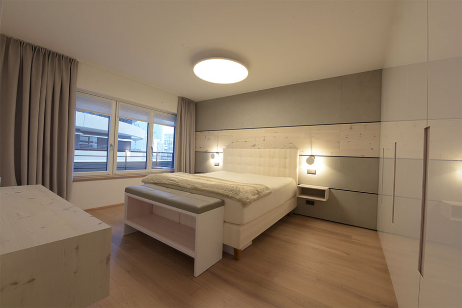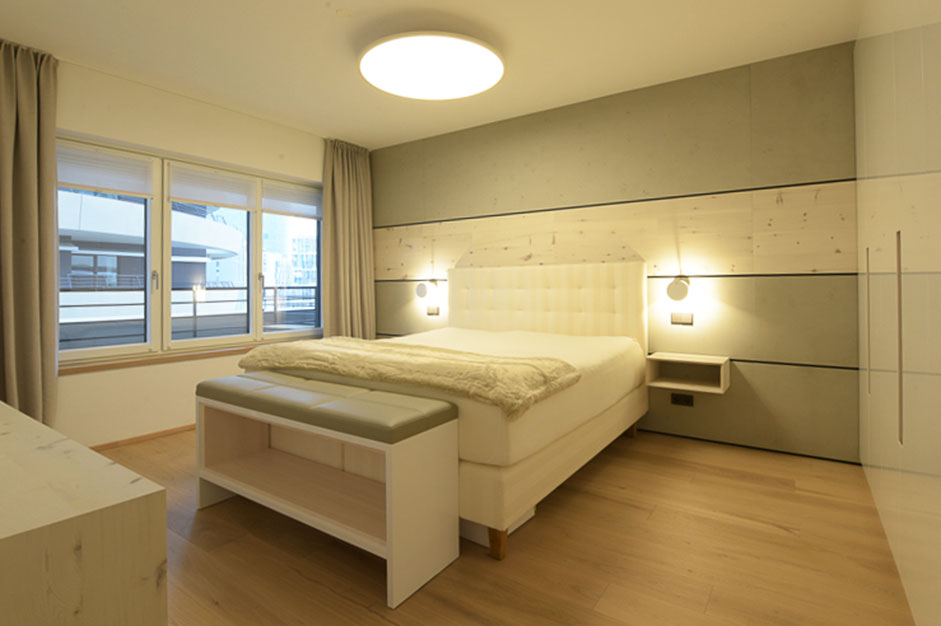 Die wandhohe Verkleidung des Headboards besteht aus einer Kombination betonartiger Oberflächen und Zirbenholz, das eine besondere Ruhe ausstrahlt.