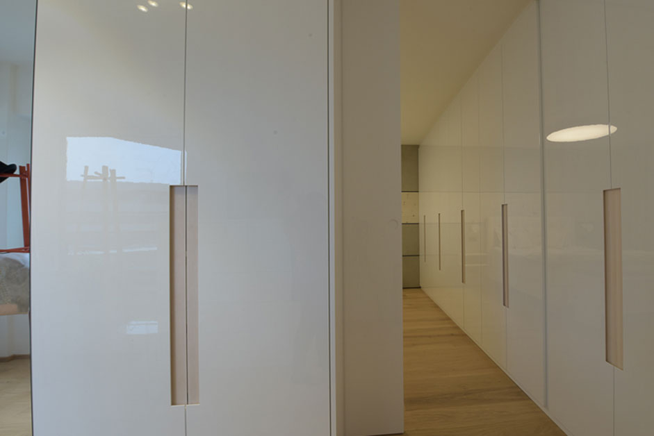 Das Badezimmer verfügt über einzigartige Designelemente, die sich von den anderen Zimmern abheben. Die Auswahl der Materialien wie Feinsteinzeug und die Planung der Details verleihen dem Badezimmer eine elegante Note. Hingegen sind Räume wie das Schlafzimmer und der Schrankraum dezenter und schlichter gestaltet, was ihnen einen ruhigen Charakter verleiht.